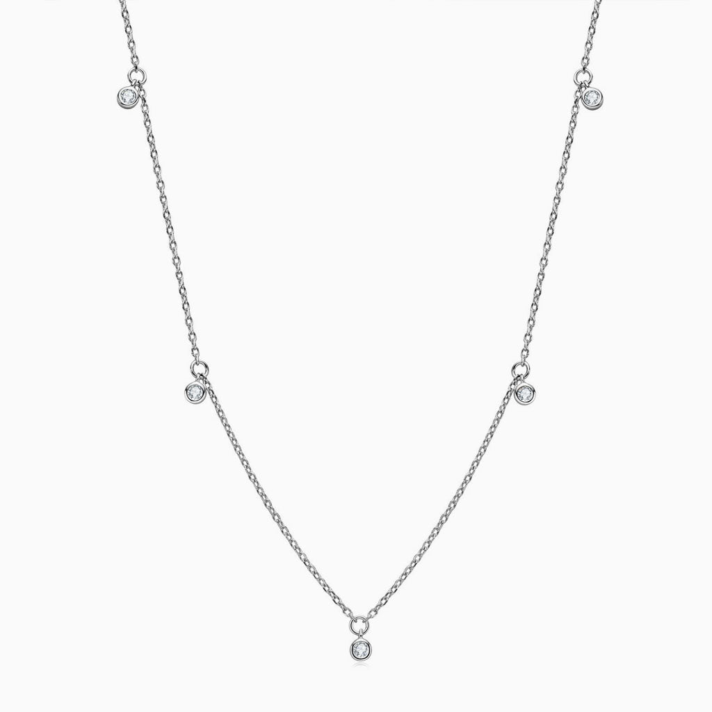 We've given a modern twist to the timeless bezel station necklace in our designer fine jewelry line. Suspended from a delicate rolo chain link. you'll discover five moissanite droplets. dangling gracefully with contrasting sparkle! This cute droplet choker is incredibly sweet and even more beautiful in person �it's something you'll love wearing over and over again.