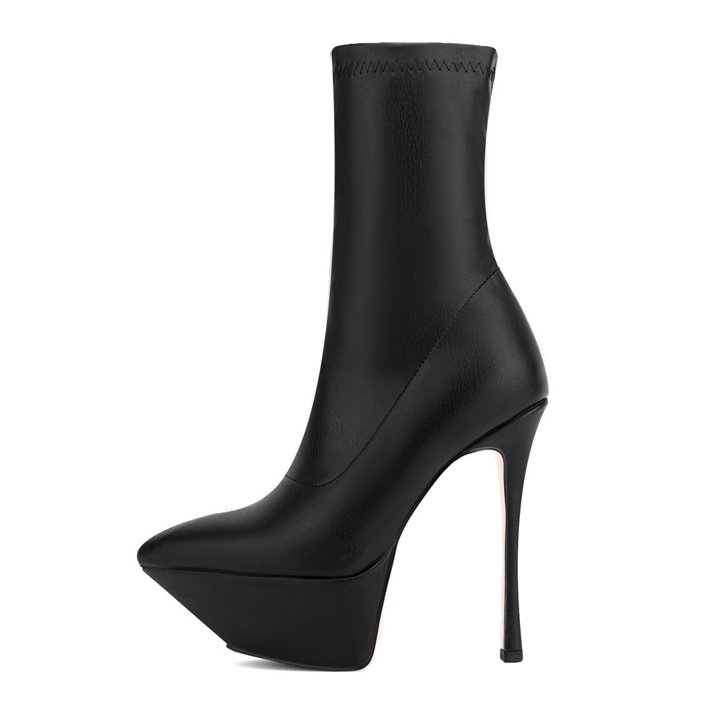 One step in these sky-high heeled boots and you'll feel confident for the rest of the day. Designed to raise you high and make you distinguish from the crowds. this stylish pair features an elegant pointy toe and the platform sole at the front and a stiletto heel with the height of 4.33 inches which makes a perfect balance between comfort and desired height. They come in with smooth black-colored exterior that's made from premium faux leather which offset the sexiness and add a cool-girl vibe. The soft fabric also gives them ample amount of stretch which makes it an easy pull-on style. Take this ultra-versatile pair on with whatever you like and you will never go wrong.