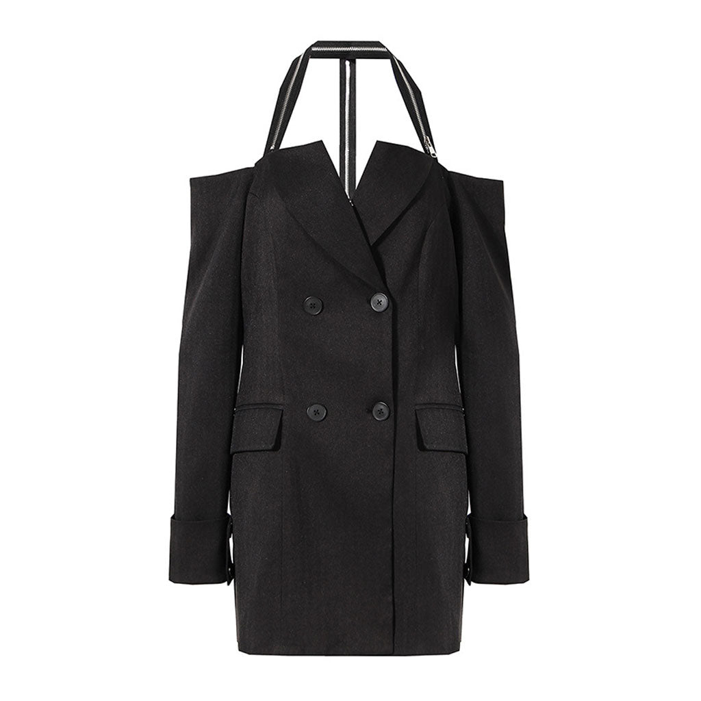 The black blazer dress comes up with a bold and quirky motif with the zip detail. The new designer collection brings lots of fun women's wear. and this one is our favorite. The blazer style cutoff on the top and showcases bare shoulders with the off-the-shoulder silhouette and strappy halter zip design. Featuring long sleeves. folded buttoned cuffs and flap front pockets. the stunning piece is detailed with the classic collars and a double-breasted closure to the front. Versatile and with the ability to grab attention. the edgy blazer dress can be worn as a blazer top or a mini dress with just a few styling tweaks.