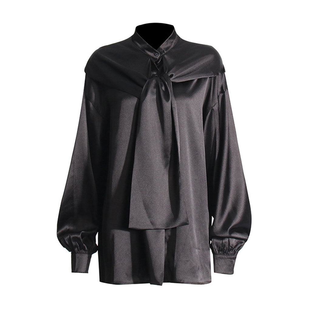 Our luxurious designer satin shirt. redefining elegance with a contemporary twist through its unique hood and tie-front design. The smooth. lustrous texture of the satin fabric drapes gracefully. enveloping you in a cocoon of comfort and luxury. We made it with slouchy lantern sleeves. which lends you a chic oversized silhouette. Perfect for both casual outings and more formal affairs. this silky satin shirt is a versatile wardrobe essential that effortlessly transitions from day to night. Pair it with tailored trousers for a chic office ensemble. or style it with jeans and heels for a sophisticated yet laid-back look that's sure to turn heads.