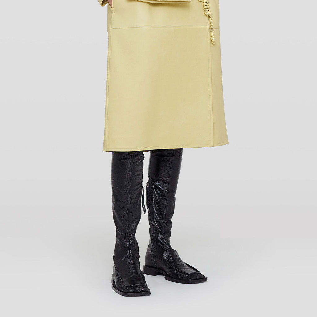 This pair of boots is such a sassy and chic one that's far from traditional. They won't let you shine dull as they form an unconventional textured upper that comes with some kinds of unstated shine. The glam pair stands out with the loafer-inspired square toe silhouette and a row of bulge stitching accent which give off a contrasting masculine coded aesthetic to this piece. Anchored by 1.38-inch block heels. they are crafted with durable rubber outsole and the slip-proof construction. Promising to keep you warm through the chilly season. they are lined with thin fur fabric inside the supple thigh-high shaft. Slide them on with calf-high zipper fastening at the side for easy wearing. They go perfectly with minimalist oversized coats whenever you need a focal point on your foot. Take these boots with you and they will promise to slay your fashion game!