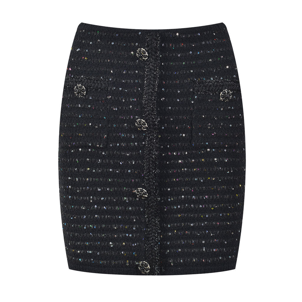 Step out in style with this shimmering fitted mini skirt. a sassy blend of acrylic and cotton. The high waisted design. accented with dazzling crystallized buttons. cinches you in all the right places. Its two patch pockets add a practical touch to the glitz. Decked out in multicolored sequins. this black designer knit skirt is a true showstopper. perfect for those who love to sparkle and sway. Whether you're hitting the dance floor or just jazzing up your day. this skirt is your go-to for a bit of razzle-dazzle. What's more. match with our colorful sequin cardigan to be the ultimate knit duo.