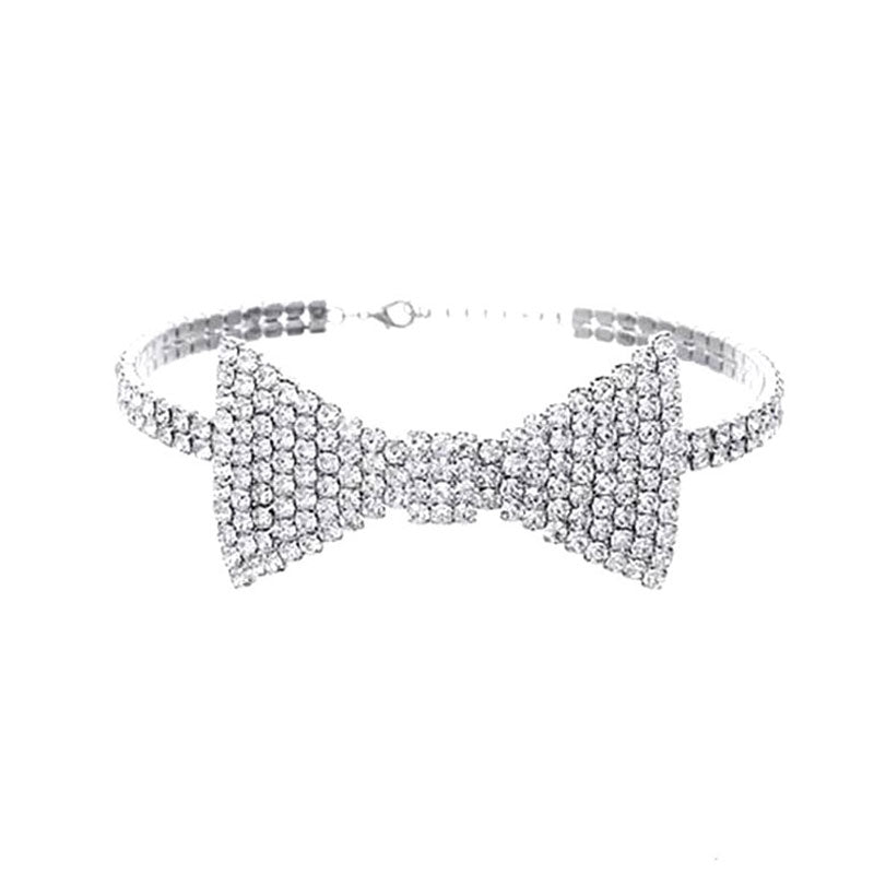 Refined and cute. a crystal bow necklace is a true one-of-a-kind piece. Meticulously crafted with dozens of tiny rhinestones. this necklace is in a choker silhouette that forms an elegant bow with shimmers. The silver-plated chain is a double row of crystal stones with faceted surfaces that catch the light. It's featured with adjustable lobster clasp closure to the back. Perfect to go mix and match with your chic blazers. it will turn heads wherever you wear it. Also a thoughtful gift for a special someone.