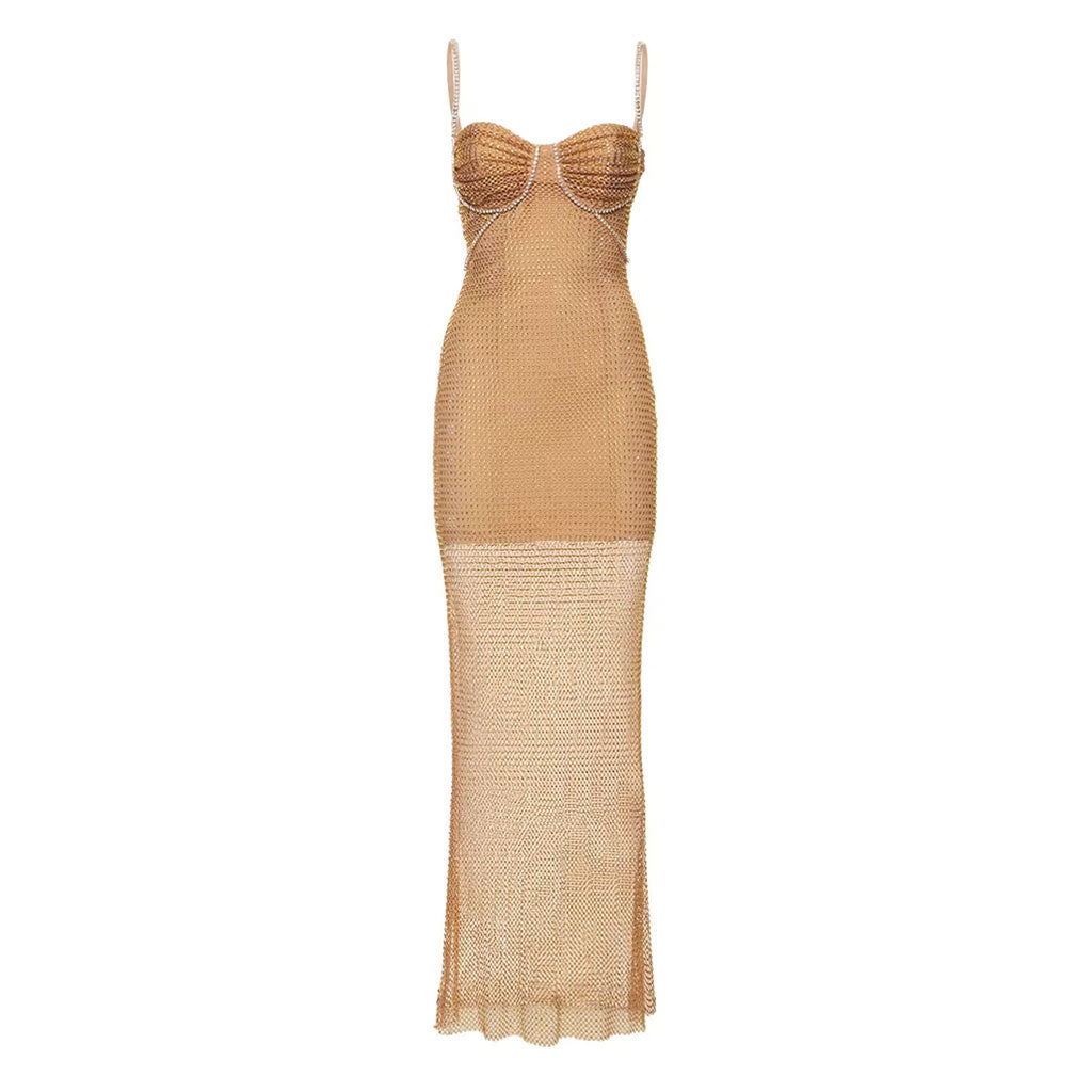 Embodying the LUXE's preference for statement designs. the fishnet mesh dress will give you all the Old-Hollywood glamour this time. Made in a double layered construction with a longer see-through fishnet mesh atop. the designer dress is completely cast from scores of faceted crystals that sparkle from every direction. Featuring pleated sweetheart neckline and a hidden rear zipper closure to the back. the sleeveless garment is trimmed with rhinestones on the slender shoulder straps and the bodice for a sophisticated highlight. This shiny dress sets you on a party path. regardless of your actual destination. Take our cue by styling it with heels and a crystal clutch bag.