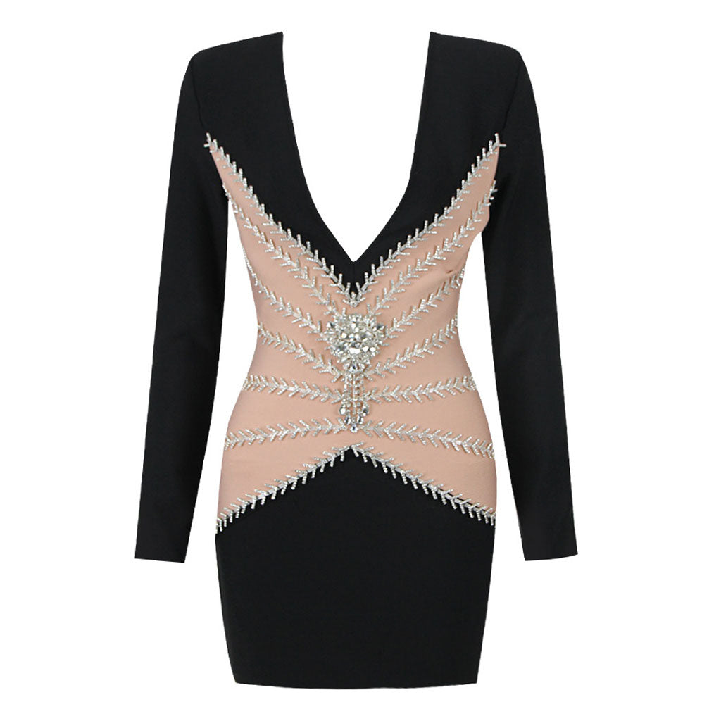 A mesmerizing rhinestone-trimmed 3D flower with fringe detail and delicate leaf embellishments. graces the nude and black bandage fabric. exuding opulence. The deep V neck and fitted silhouette enhance allure. while long sleeves and a thigh-length hem exude elegance. Effortless yet captivating. this designer party minidress is perfect for making an entrance at any sophisticated party. Complete with a discreet rear zipper. it's a seamless blend of style and sophistication.