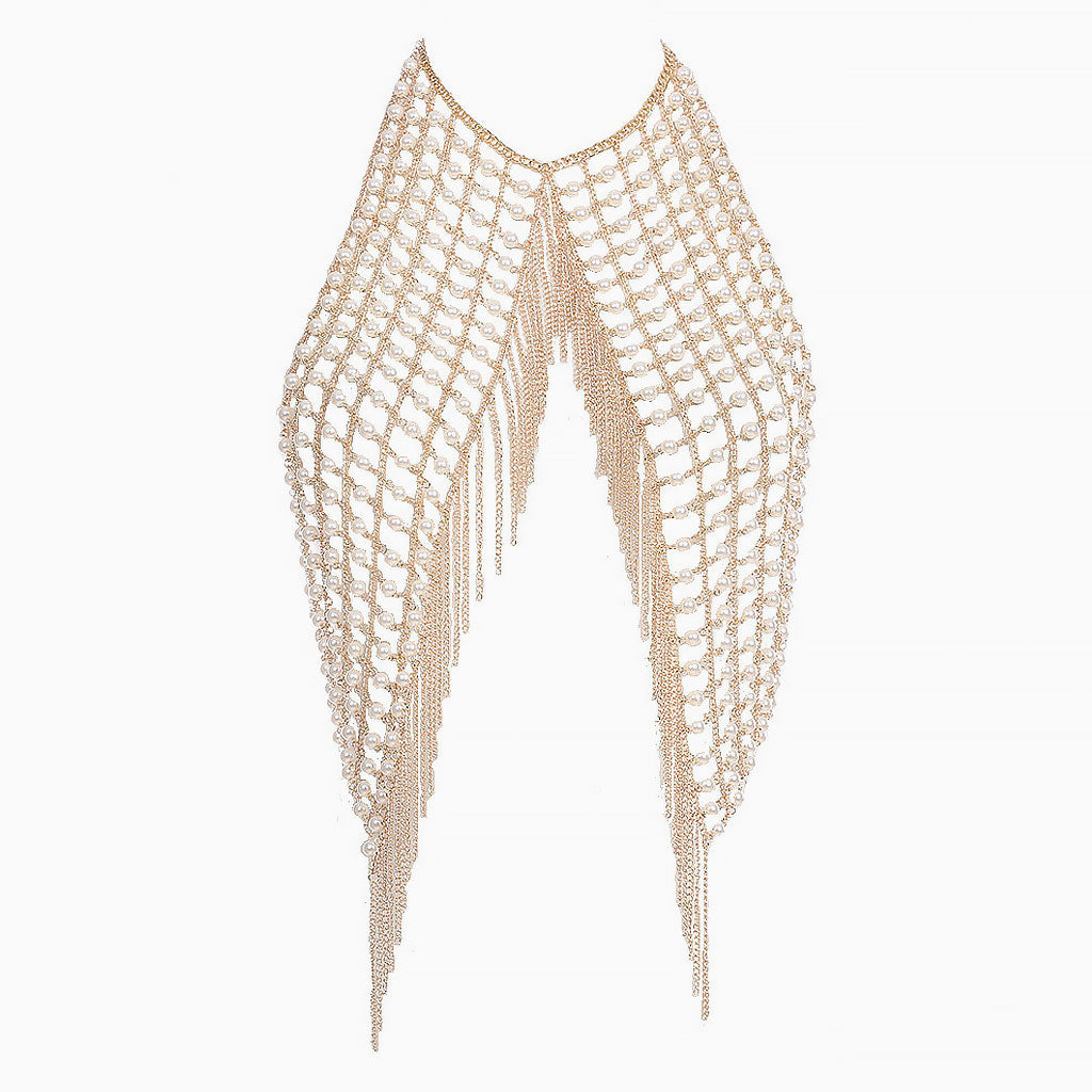 Get ready to shine like a disco ball under the sun or club lights with our designer pearl chainlink top. This sexy metallic beaded top boasts hollow-out chain links adorned with imitation pearls and flowy fringes. serving beachside sass or nightclub glam with equal flair. Let's party!