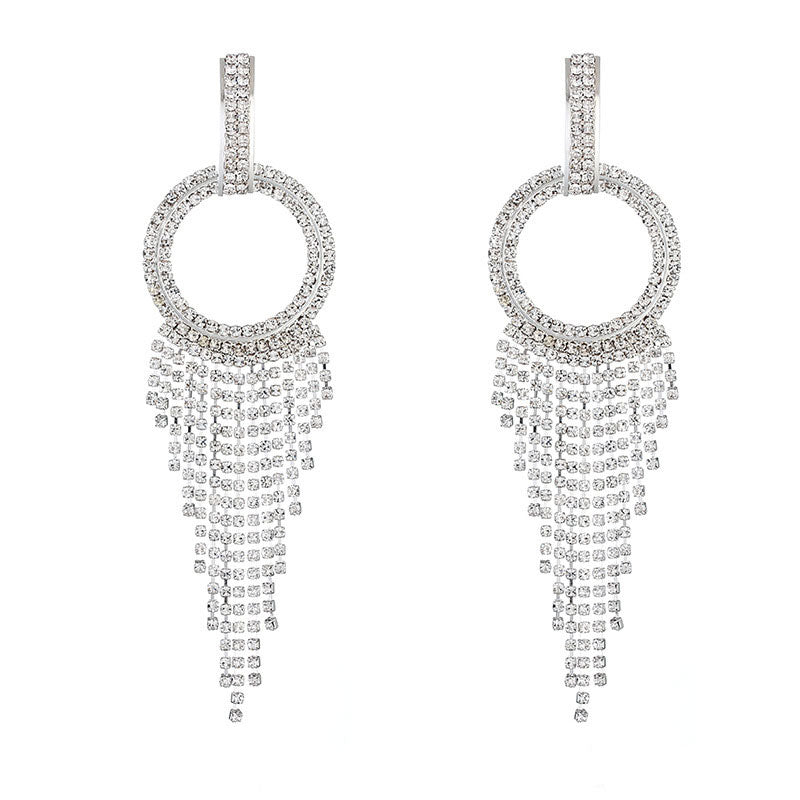 If you're looking for the attention-grabbing of long earrings. then look no further. These hoop-fringe earrings will do the job. Featuring a chic hoop ring that's dropping along the jawline and is dangled with V-silhouette swingy chains to accentuate the neck. This pair is clustered with shimmering rhinestones. which are bound to catch the light as you move. Make a statement and add to your feminine look with this pair and wear yours with a strapless party dress to give your evening night-out outfit an elevated glow.