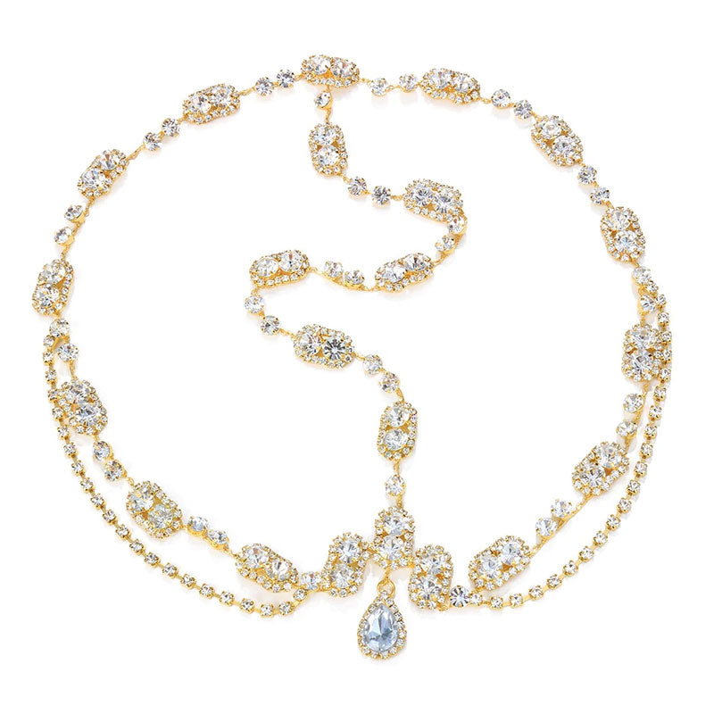 Elegant and sophisticated. this head chain is a gorgeous way to add sparkle to your bridal look. The headpiece is cut in layers with a trio crystal chains that drape along the hair. framing the face. Mixed by the circular cut stones and oval-shaped sparkles. this luxury piece is featured with a dazzling teardrop gem pendant hanging right the center of your forehead. giving you a truly unforgettable moment. The crystal headdress is made in an easy pulling-on style. Crown yours with a delicate veil for a glamorous bridal look.