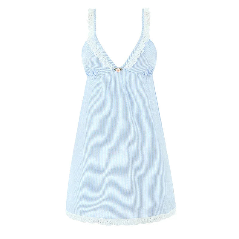 The Summer Evenings // Dress is a dreamy. lightweight slip dress in pale blue micro-stripes with soft white lace trim and a delicate shell charm detail. With its flattering V-neckline and breezy silhouette. it's made for slow sunsets. warm nights. and sweet nostalgia.