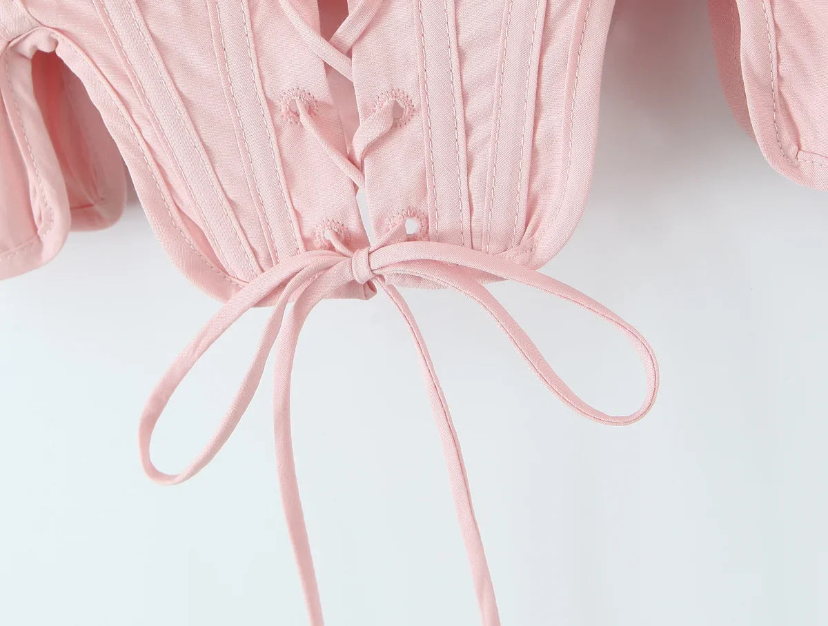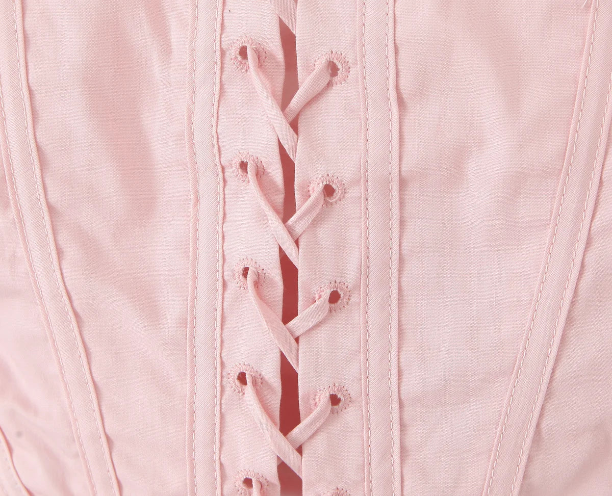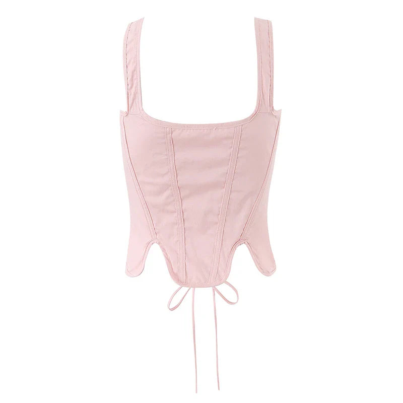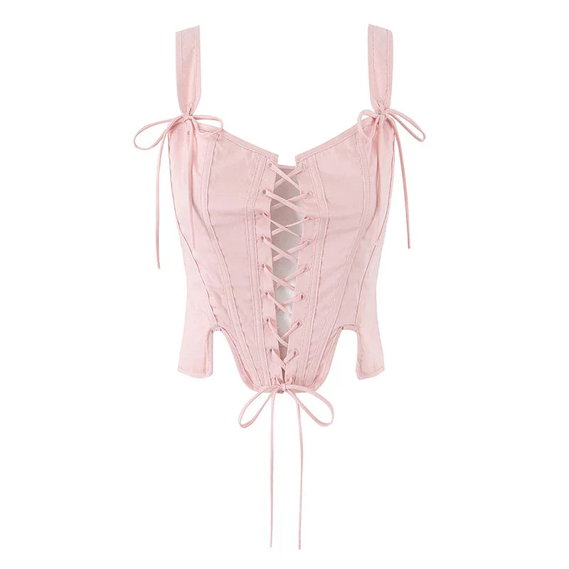 The Summer Stories // Corset features a flattering lace-up front and delicate ribbon shoulder ties. offering both structure and charm. Its sweetheart neckline and sculpting fit make it a romantic staple for soft girl summer looks.
