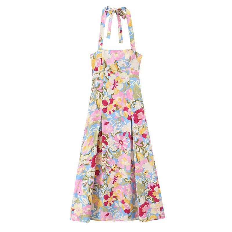 The Sun & Dreams // Dress brings a vibrant burst of summer to your wardrobe. With its retro floral pattern. tie halter neckline. and elegant A-line silhouette. it's perfect for sunlit days and dreamlike evenings alike.