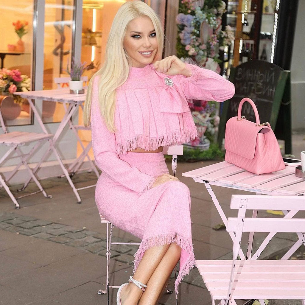 Sparkle in the elegance of the big bow with this luxurious designer tweed set. Beneath the mock neck. a crystal-trimmed big bow adorns the boxy bodice. boasting pleated details and tassels in a cropped hem for refined sophistication. Tassel trimmed long sleeves and a metal rear zipper add a touch of timeless grace. Paired effortlessly with an elasticated high waistband fringe maxi skirt featuring a back vent and discreet zipper. it embodies gentle sophistication and ethereal romance.