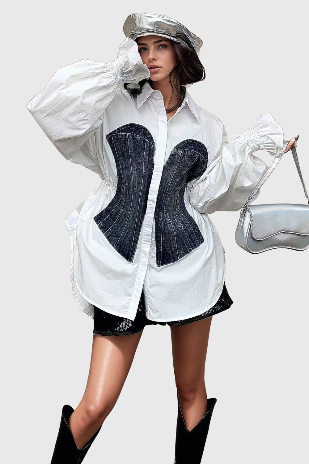 This stylish tailored shirt features classic details like a collar and buttons down the front. combined with a contemporary twist: a fitted dark blue denim corset with a sweetheart neckline. Elastic cuffs complete the design. ensuring a comfortable fit.