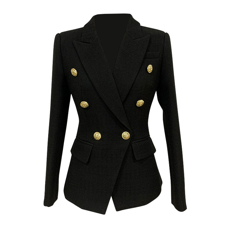 Add a tidy finish to your everyday ensembles with our designer label's blazer. The linen fabric plays a unique spin keeping it feeling fresh. The padded shoulders and darted waist add to the tailored feel of this jacket. Featuring peak lapels. long sleeves and flap front pockets. this smart jacket comes in black or white shades and is adorned with chic gold-toned buttons for a luxury update. Versatile and oh-so flattering. this blazer is ideal for work or really any occasion. Make it an easy way to add some polished touch to your favorite jeans and heels.