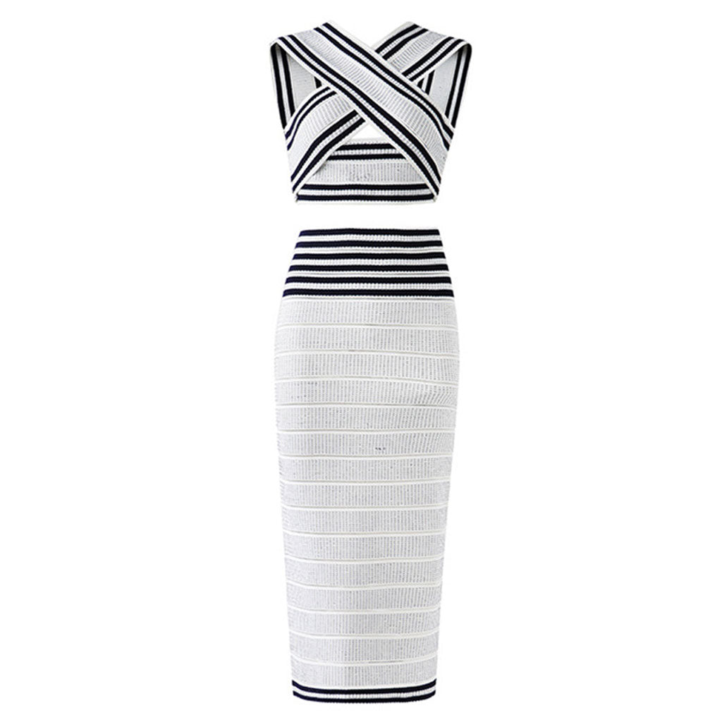 Your summer knitwear for the fancy party is here! The unique designer knit construction is crafted from springy viscose with the tiny loop detail to ensure the brand's talented modern approach to the design. The knit top is cropped with blue-and-white striped crossover straps that lend it a chic nautical feel. which is ultimately finished with a metal zip fastening to the back. The matching midi-skirt showcases a slim fitted silhouette and features exposed zip closure with full-length echoing the top. Get the whole set and style yours with heeled pumps and a shoulder bag. You look great!