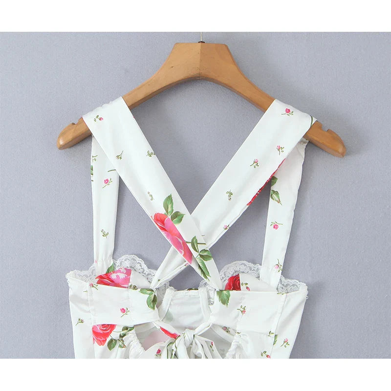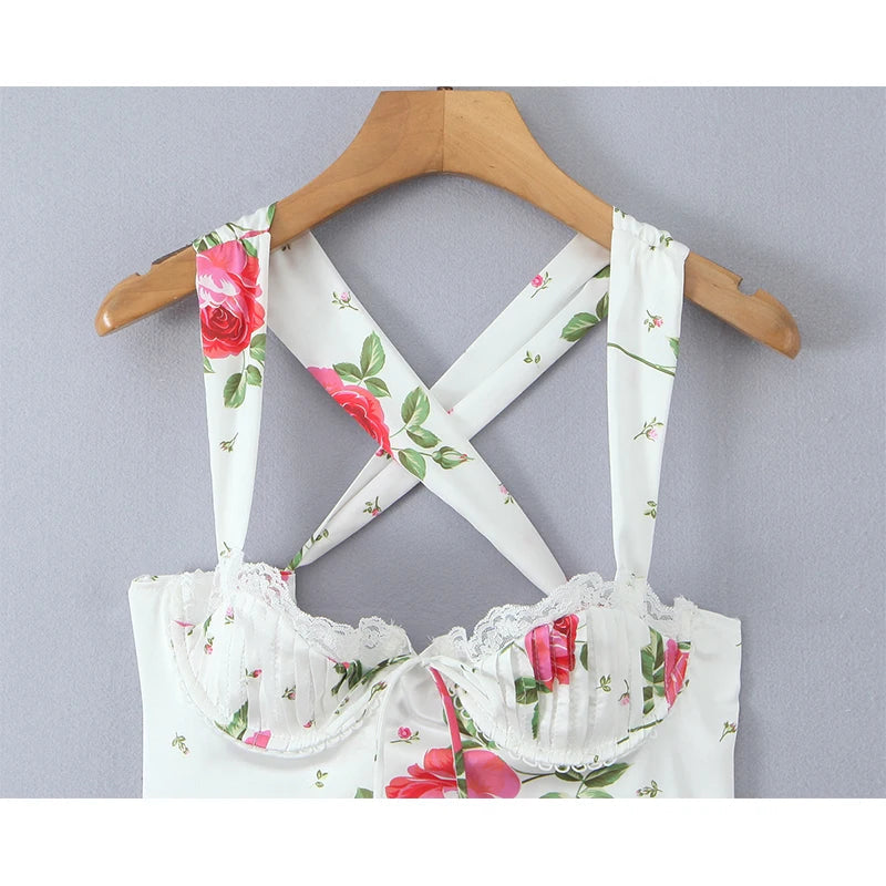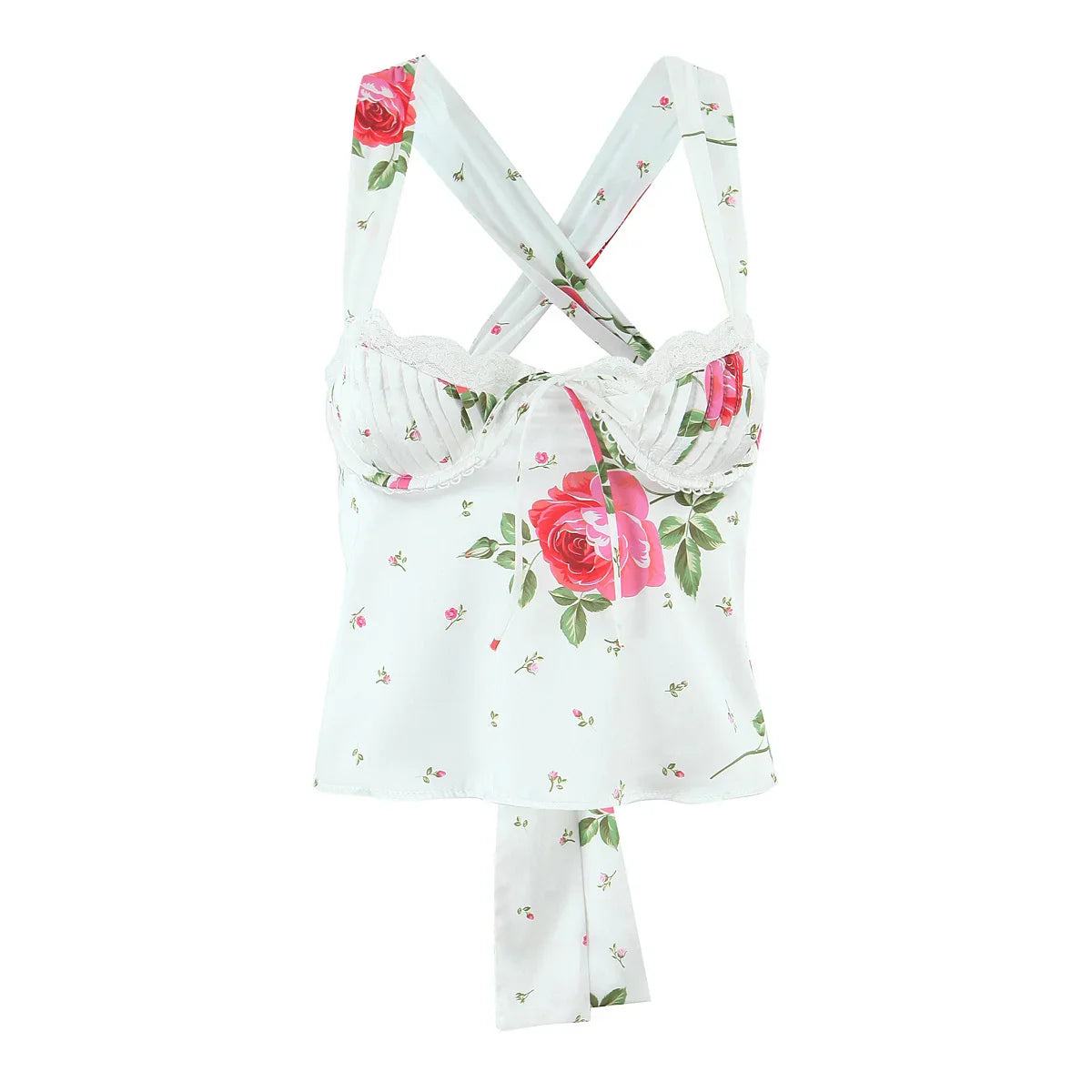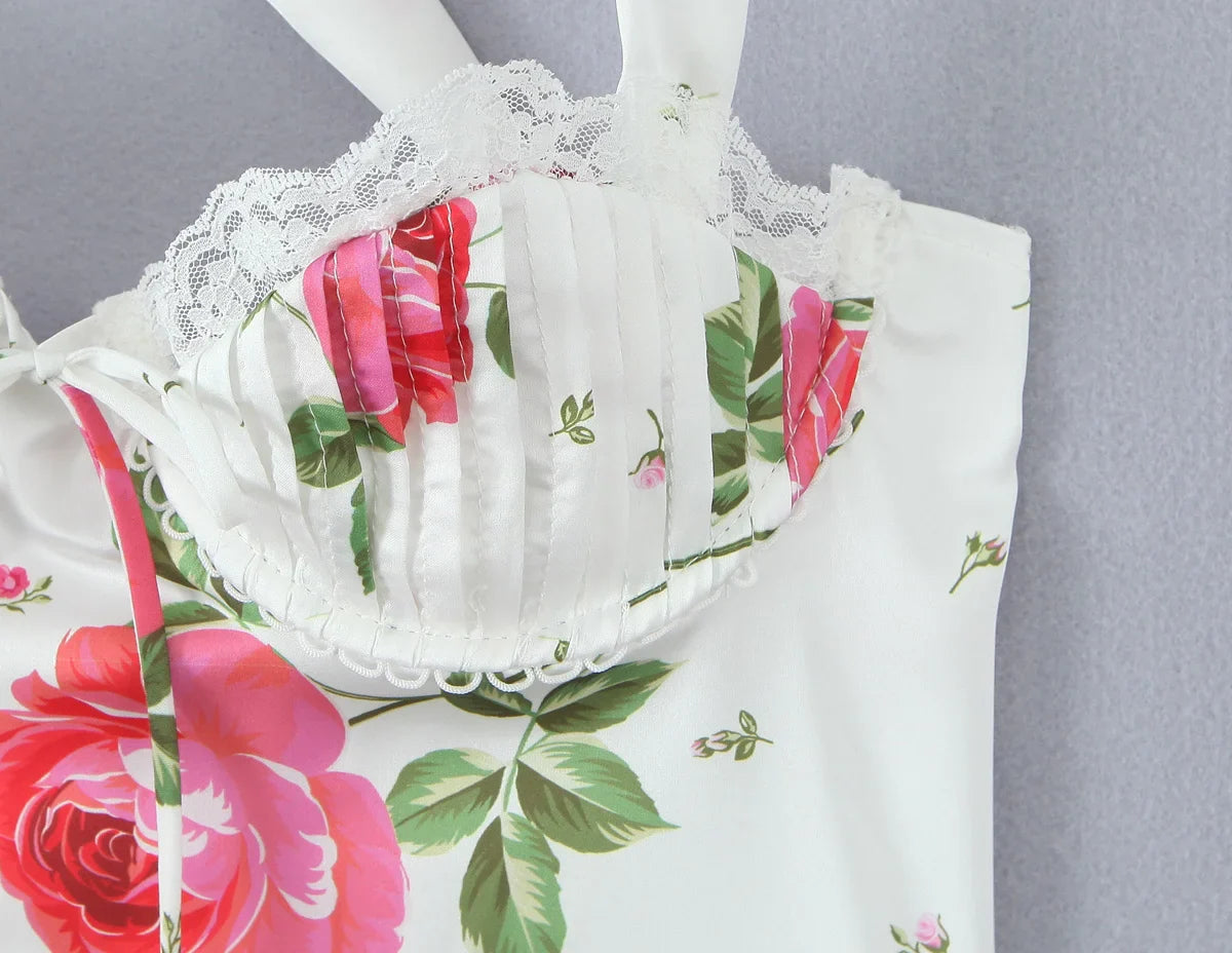 The Toria // Top features a stunning rose print. structured bustier fit. and delicate lace trim for a look that blends romantic florals with sultry vintage charm. Ideal for layering or as a statement summer piece.