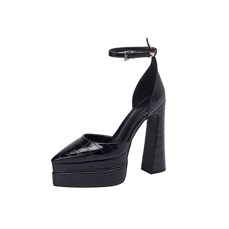 Achieving sky-high style has never been so easy than with these pumps! A crocodile embossed leather in vibrant hue is accessorized with elegant pointed toe upper. slender ankle straps with adjustable clasps and a cute heel cap behind. Designed to bring height to any look. this style gives a novelty heel shape while still being stable. Thanks to the heavy platform construction. they allow us to express our very personal style without getting too much pain of that height. Show yours off with a chic mini skirt or ankle-grazing trousers.