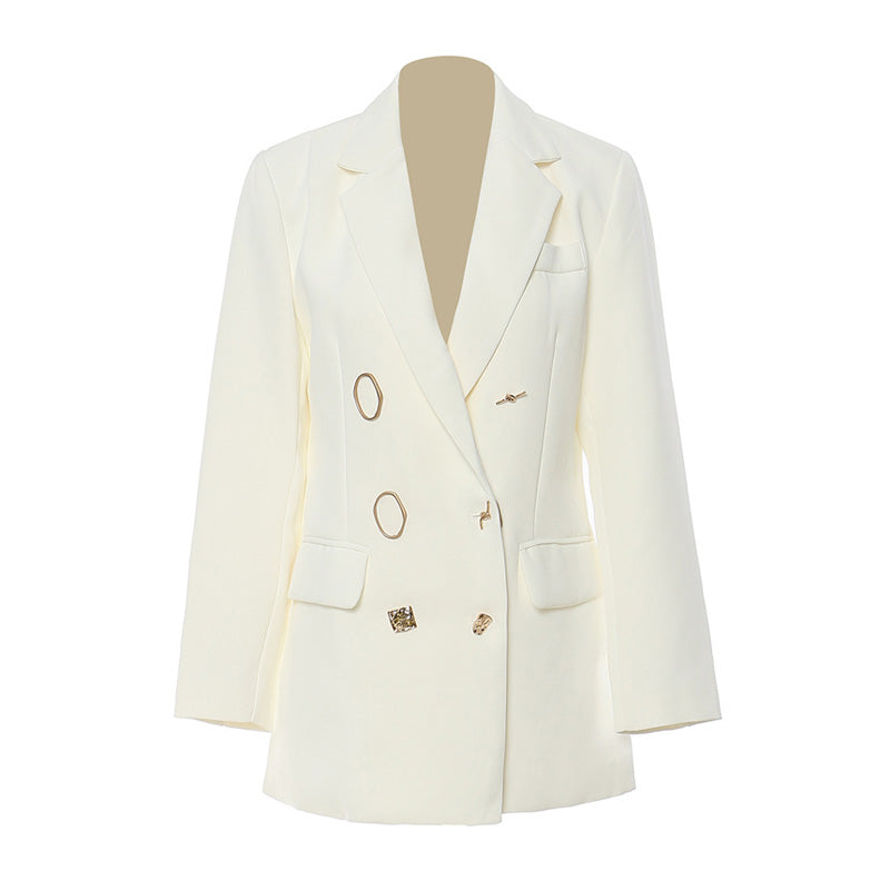 Cute button details can be a playful upgrade to your blazer staples. Set in our favorite off-white shade to glam up your look. the designer blazer sports all the classic elements with lapel collars. long sleeves. strong shoulders. flap front pockets and a rear vented hem. The form-fitting silhouette is enhanced by the princess seams and we love how this double-breasted piece is adorned with gold-toned button hardware of fun shapes and styles. Exuding joyfulness and creative. this fun testament to the label's art-meet-classic blazer is super comfortable and elegant which is highly recommended this season.