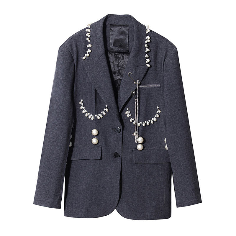 Evoking the creative Luxedress's long-standing signatures in our new designer collection. this blazer is full of details that's too far from simplicity. Featuring single-breasted fastening. functional pockets and long sleeves with strong padded shoulders. the gray blazer is specially designed with undone trims along the sleeves and the central back which is all about the unexpectedly chic reveal. The pin details with the silver chain adorn the collar giving so many styles. so do the imitation pearls. Luxury and unique. this loose blazer is your new go-to outerwear that you'll want to slip into immediately. Try to style yours with a trendy pleated skirt and ankle boots for an outstanding edit of silhouette.