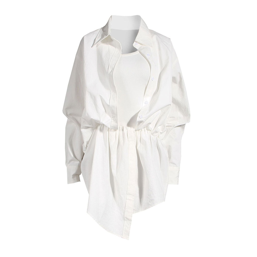 Luxedress's signature avant-garde approach is showcased in this all-white dress from our designer collection this season. Combining the off-duty model nonchalance and casual free-ease style. this shirt dress is a unique hybrid piece that you can only shop in our designer boutique. It's crafted with cotton and polyamide blend with an oversized cut to create a dress shirt styling which is layered over a basic sleeveless tank. The folded collar. long sleeves and button-front make it a classic shirt style. while the elasticized waistband give the right amount of stretch for a fitted look. Make it yours and match it with shorts or skinny jeans. Try to customize your personal style with the sleeve off and tied the waist. That's what the fashionistas do when they're heading out.