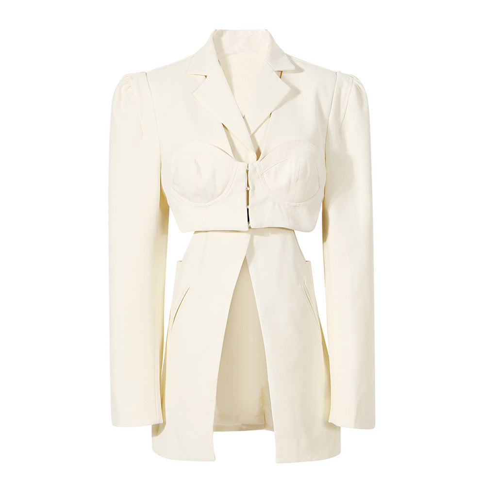 The modern blazer with a different take on the classic silhouette. Don't miss this! Available in beige and black hues for your choice. the suit jacket from our new designer collection takes the shape of a slim tailored silhouette with a slightly puff long sleeves. slanted welt pockets and a single button fastening under the layered sweetheart bustier with a row of hook-and-eye closure to the front. The side cut-outs accentuate the waist to offer a unique twist on the trend. Keep a coordinating look with the matching skinny pants and heels to exude a little stylish. mature flair.