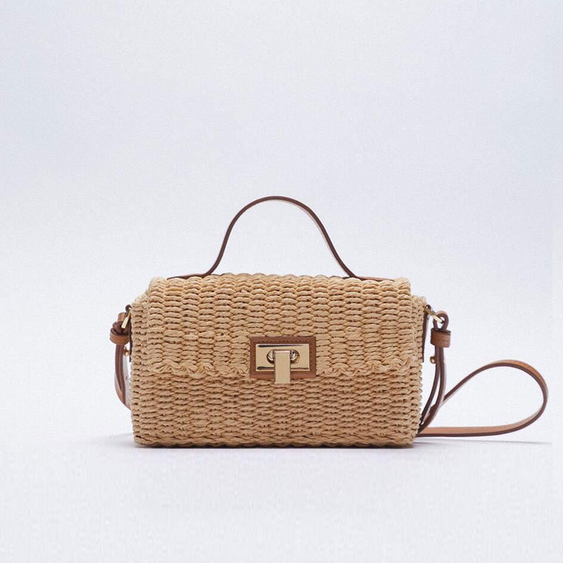 This raffia mini bag is the must-have accessory of the season! Crafted with raffia-like fabric and imitated leather. stand out in handmade weave details allover. featuring a leather top handle. a flap top accented with a metallic lock closure. a massive compartment. and an adjustable shoulder strap decorated with seamed stitching charms. Find more trendy women's woven bags or unique bags in our boutique. and style it with a floral sundress for an idyllic look.
