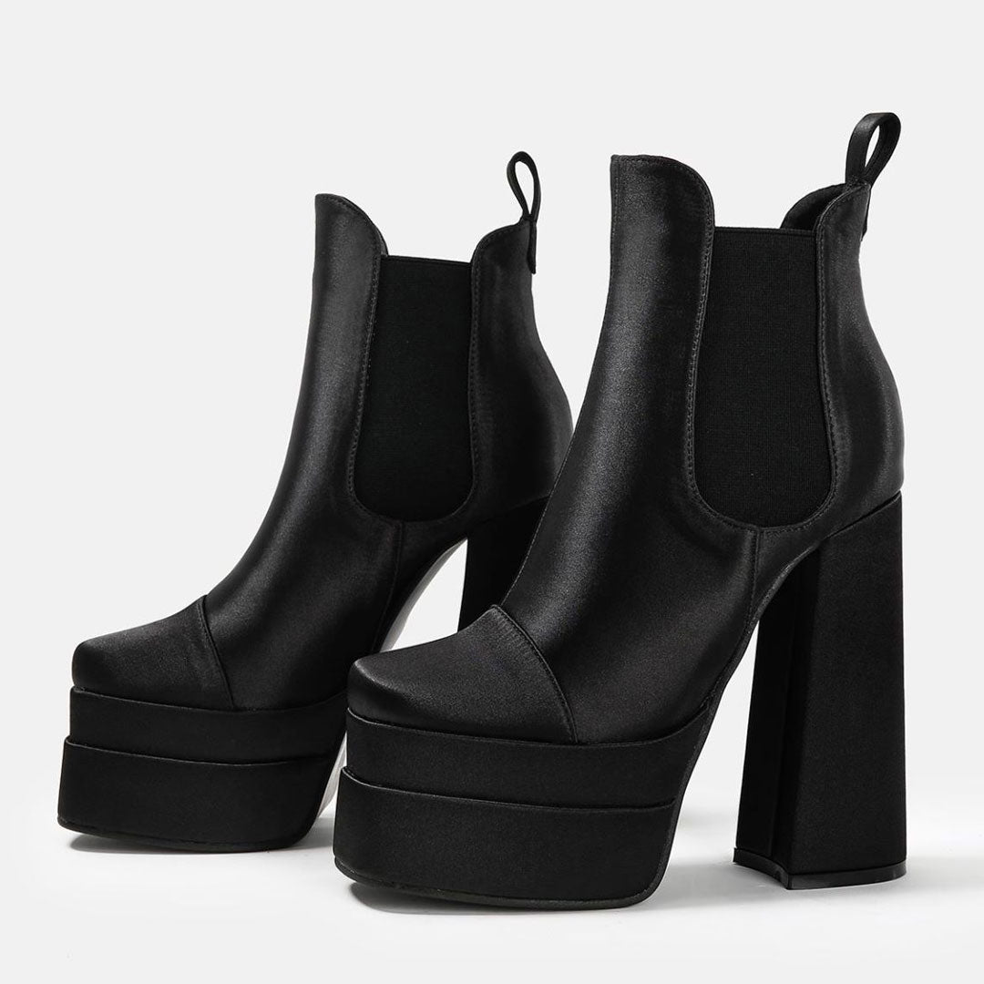Give women the right pair of high-heel boots and see them conquer the world like no one else. Made of sheen satin. PU leather and rubber. stand out in an exaggerated platform. featuring a square closed toe enhanced by an upper with panelled design. an asymmetric opening accented with a pull tab. a slip-on styling trimmed with an elastic gore. a synthetic cushioned footbed anchored by block high heel. Find more trendy women's block-heel boots and unique shoes in our boutique. and try them on with a sexy dress and a sparkly choker - Heel height: 14cm.