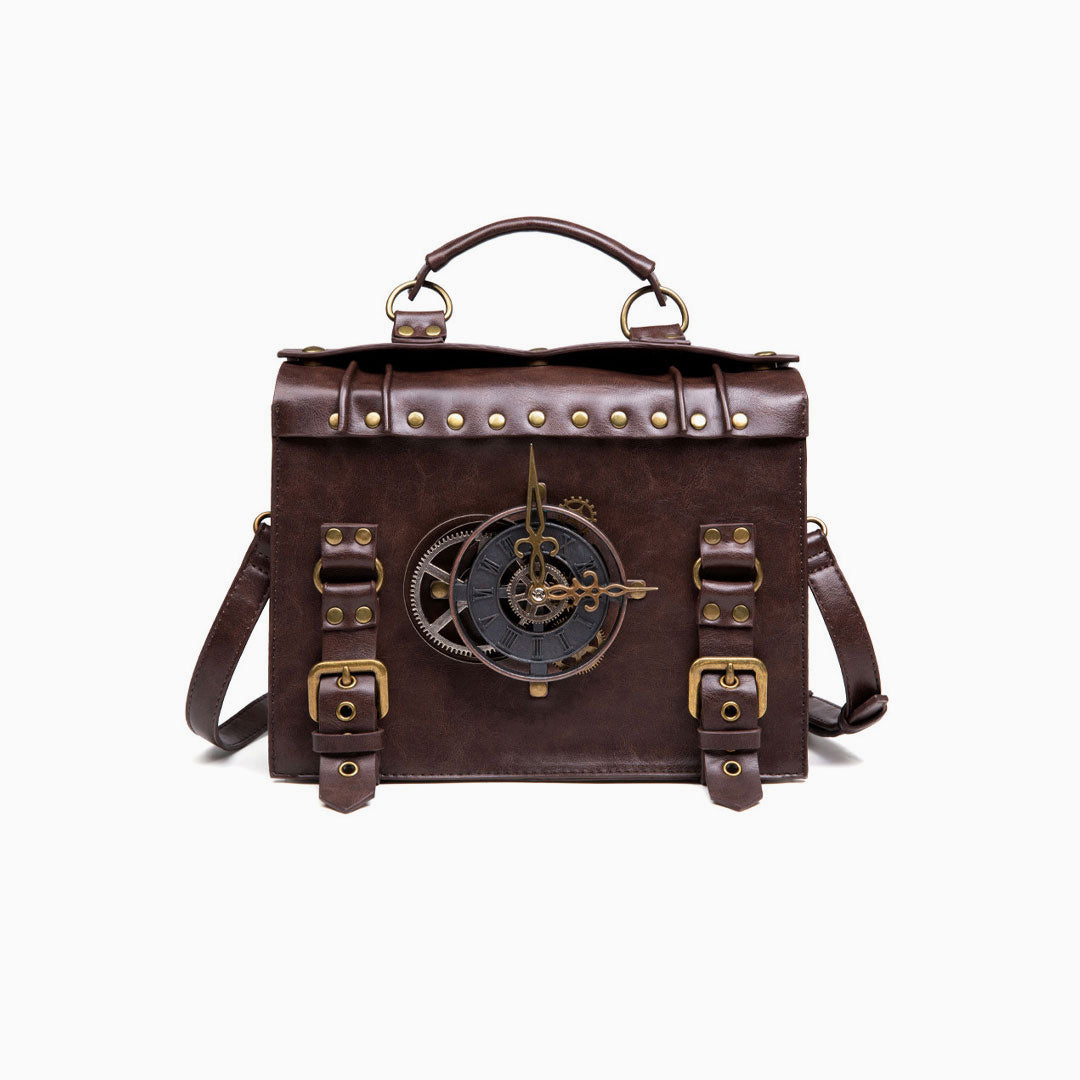 Give your style a retro edge with this crossbody satchel. Made from faux leather material. embellished with a clock front with studs and double buckle straps. featuring a handle on the top and a fold-over with button closure. adjustable and detachable shoulder strap. lined interior with a card slot and a zippered pocket. Find more trendy women's crossbody bags or chic bags in our boutique. and finish your vintage look with our unique accessories.