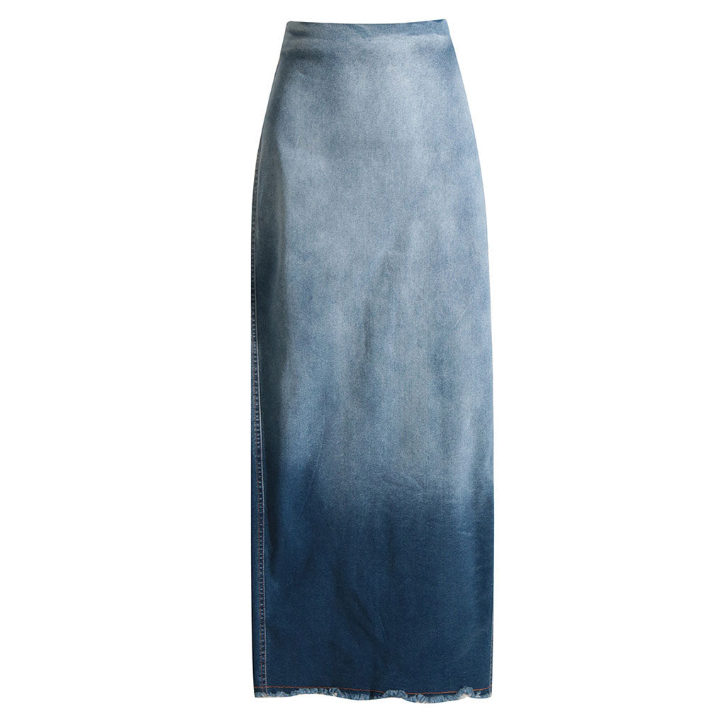 One of the hottest denim silhouettes of this summer season is maxi skirt. Now here's the chance. This designer skirt is made with super comfortable denim fabric in faded gradient shades to lend you the early aught's retro vibes. Featuring a metal zip closure and a rear slit for easy wear and freely move. this long denim skirt is detailed with the undone frayed trim to give you a worn-in look. Raise up with the hottest summer vibe by pairing it with a cute crop top and sneakers. which is pretty much perfect for your everyday wear.