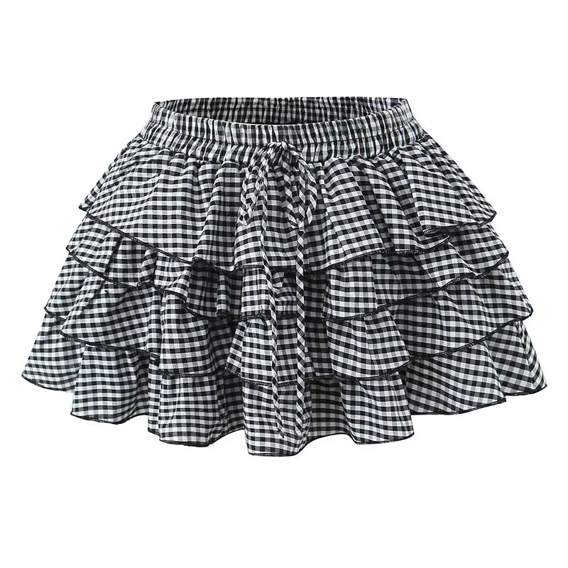 The Vitamin Sea Skirt features a playful. gingham print with ruffled layers. This skirt is perfect for adding a fresh and fun vibe to your wardrobe. offering a relaxed and comfortable fit.