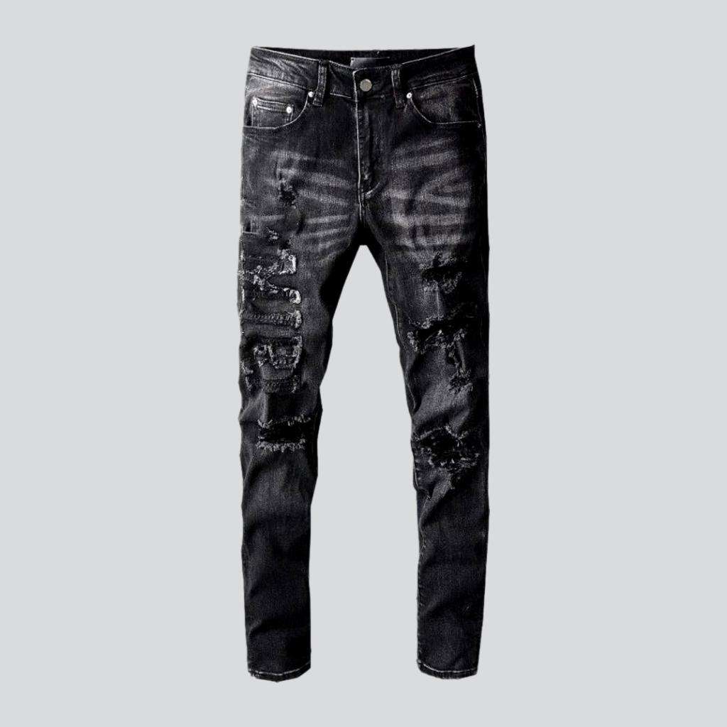 Make a statement with our 2023 Spring-Summer Men's Collection ââ‚?Whiskered Distressed Black Jeans! Sleek. stylish. and utterly chic. these jeans combine contemporary vogue with vintage punkish for an effortlessly cool look.