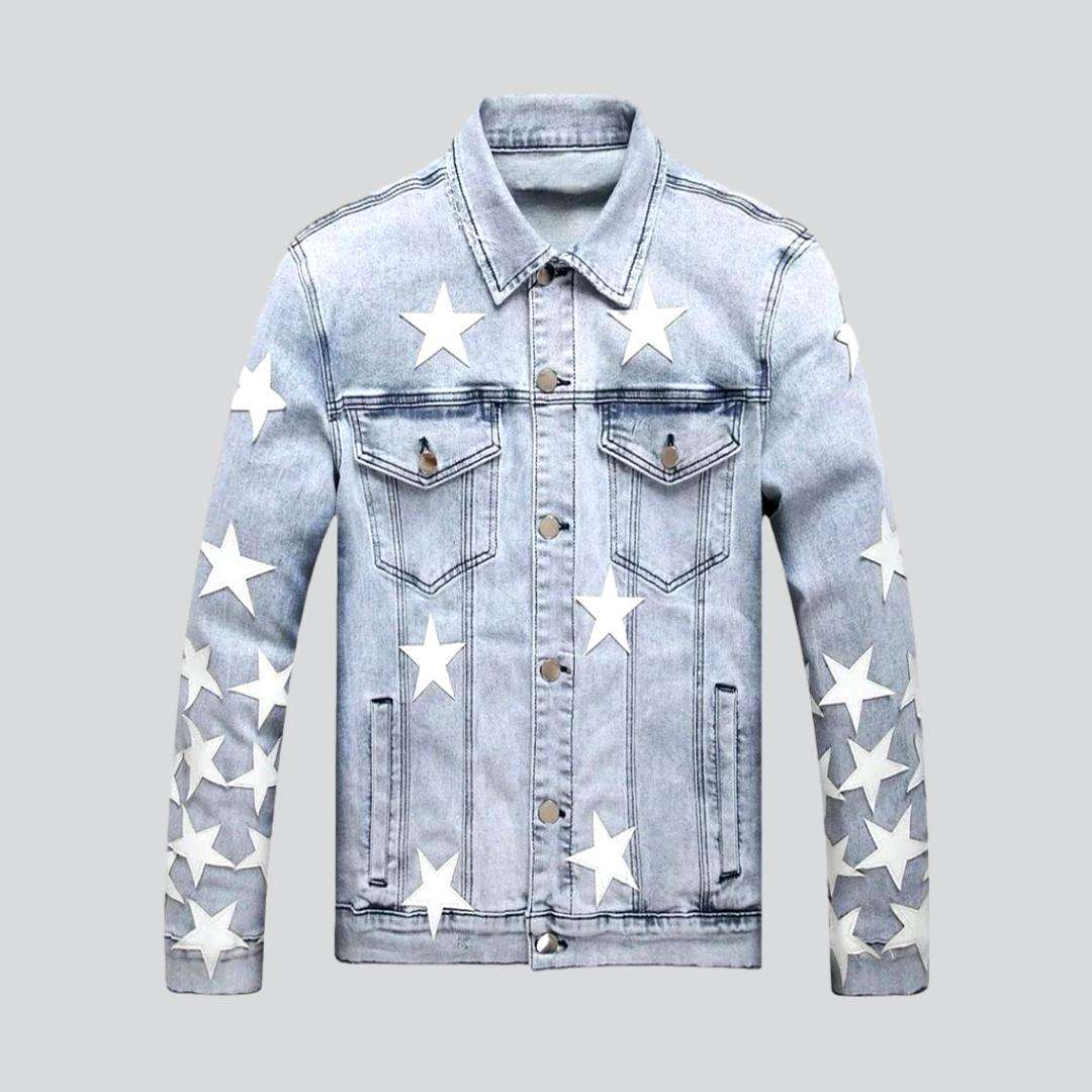 Be the envy of all your friends and show off your unique fashion sense with this White Stars Light Denim Jacket from the 2023 Spring-Summer Collection today!