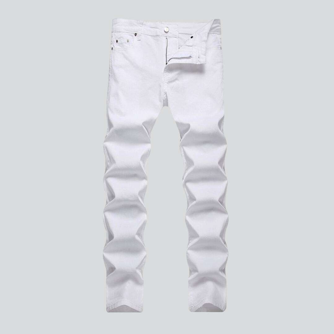 The 2023 Spring-Summer Collection from Brand Name introduces its white stretch jeans for men. the ultimate combination of casual trend and sophistication. These mid-waist jeans feature a slim fit. zipper & button closure. and a stretchy fabric for extra comfort and a flattering fit type.