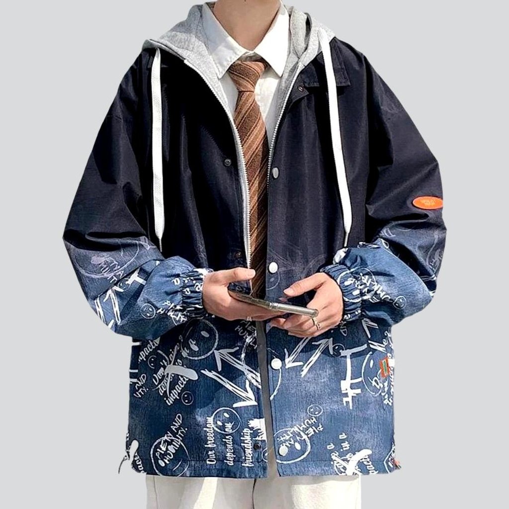 This jacket has been textured with meticulous attention to detail. fusing together the best of the old and the new. The graffiti-print painted over the denim fabric adds a hint of edginess while the contrast trimming on the hood and buttoned closure gives it a classic appeal.